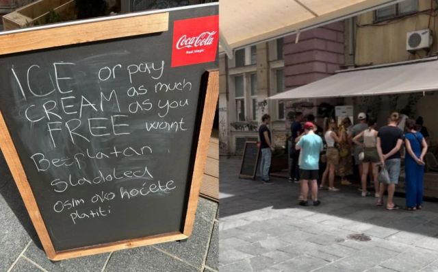 Dok su neki ugostiteljski objekti u petak, 21. juna, prodavali sladoled po nižoj cijeni, jedan se izdvojio među njima i obradovao posjetitelje besplatnim sladoledom.