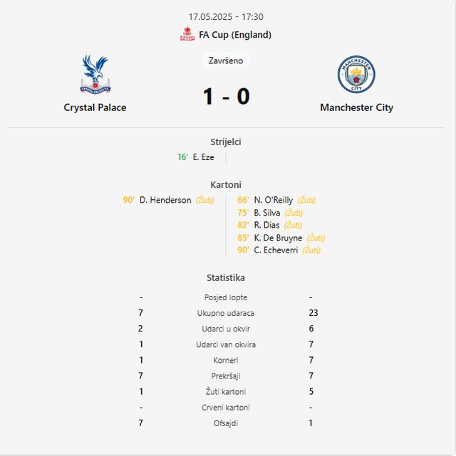 Tako je na najgori mogući način završena košmarna sezona za Pepa Guardiolu i njegov skupocijeni tim. S druge strane, Crystal Palace slavi najveći trofej u historiji kluba.