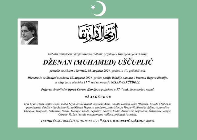 Dženaza proslavljenom igraču i treneru FK Sarajevo Dženanu Uščupliću (49) bit će klanjana u subotu 10. avgusta poslije ikindija namaza u haremu Begove džamije.