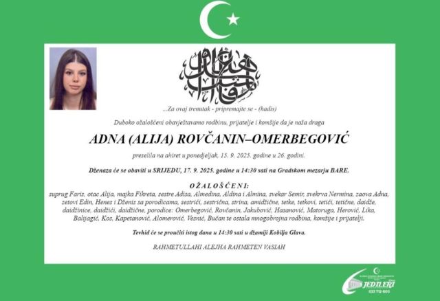 Dženaza će se obaviti u srijedu, 17. septembra 2025. godine, u 14:30 sati na Gradskom mezarju Bare. Tevhid će se proučiti istog dana u isto vrijeme u džamiji Kobilja Glava.