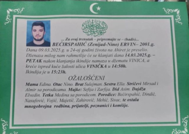 Dženaza Ervina Bećirspahića koji je mučki ubijen u Visokom klanjat će se sutra nakon ikindija namaza u džematu Vinica.