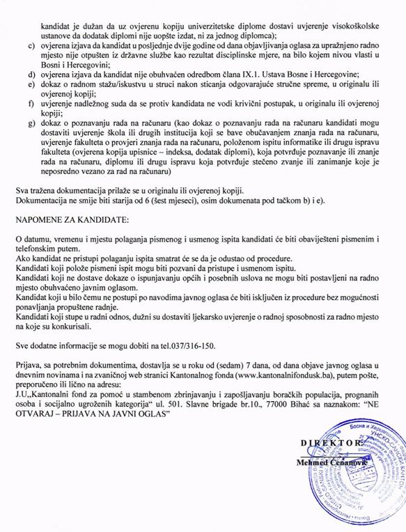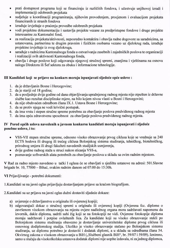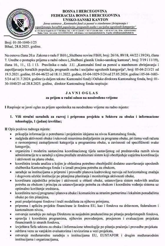 Na osnovu Zakona o radu FBiH i drugih propisa, JU Kantonalni fond Bihać raspisuje javni oglas za prijem zaposlenika na neodređeno vrijeme.