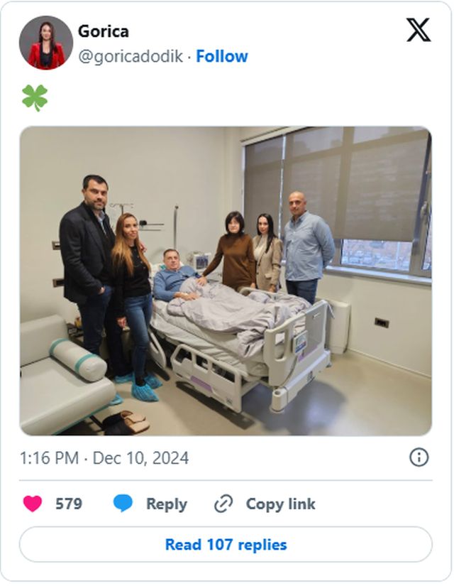 Gorica Dodik, kćerka predsjednika Republike Srpske Milorada Dodika, podijelila je na društvenim mrežama fotografiju sa ocem nakon njegove jučerašnje operacije.