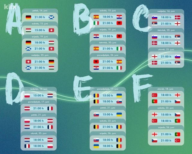 Žrijeb grupa se održao 2. decembra prošle godine u Hamburgu, a u nastavku možete pogledati kompletan raspored Eura sve do 14. jula 2024. godine.