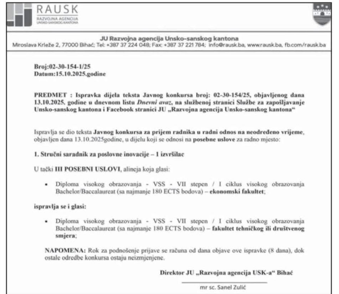 Samo tri dana nakon što je JU “Razvojna agencija Unsko-sanskog kantona” objavila javni konkurs za prijem radnika na neodređeno vrijeme, direktor Agencije mr. sc. Sanel Zulić potpisao je ispravku kojom su izmijenjeni uslovi za prijem u radni odnos na poziciju stručni saradnik za poslovne inovacije.