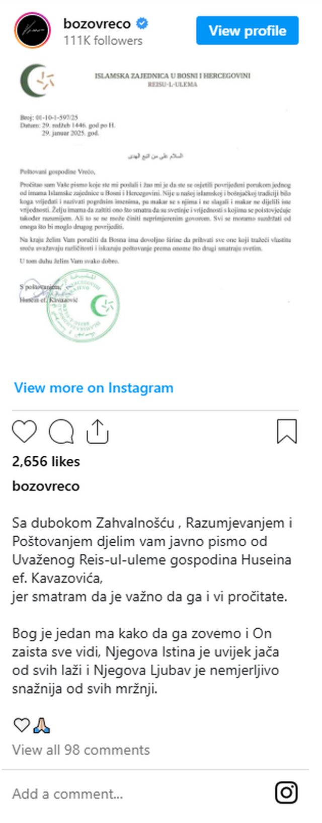 Onda je stiglo pismo Reisa Kavazovića koje je Vrećo podijelio na svom Instagram profilu.