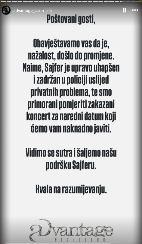 – Poštovani gosti, obavještavamo vas da je, nažalost, došlo do promjene. Naime, Sajfer je upravo uhapšen i zadržan u policiji usljed privatnih problema te smo primorani pomjeriti zakazani koncert za naredni datum koji ćemo vam naknadno javiti.