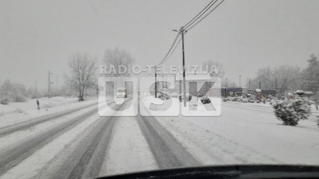 Zimske službe rade na čišćenju puteva. Cesta je sužena zbog velikih nanosi snijega, a kolovoz je klizav.