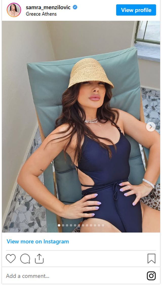 Naime, pozirala je u jednodijelnom kupaćem kostimu izrezanom sa strane. Ovakav kroj kupaćeg kostima će definitivno biti modni hit ovog ljeta s obzirom na to da ga mnoge dame radije biraju u odnosu na bikini. Menzilović-Ćatić je upotpunila izgled šeširićem i nakitom.