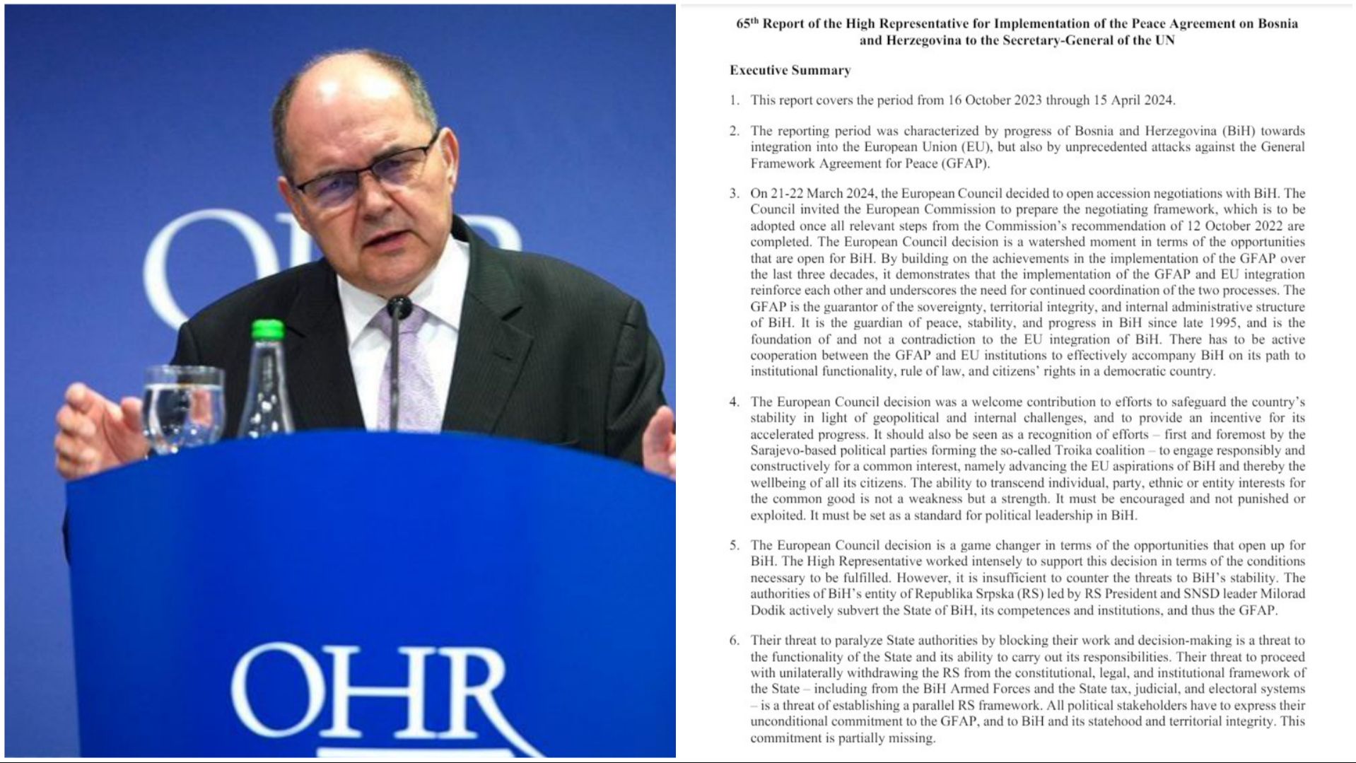 Visoki predstavnik je upozorio na vlasti RS predvođene predsjednikom RS i liderom SNSD-a Miloradom Dodikom, koje “aktivno podrivaju državu BiH, njene nadležnosti i institucije, a time i Dejtonski sporazum”.