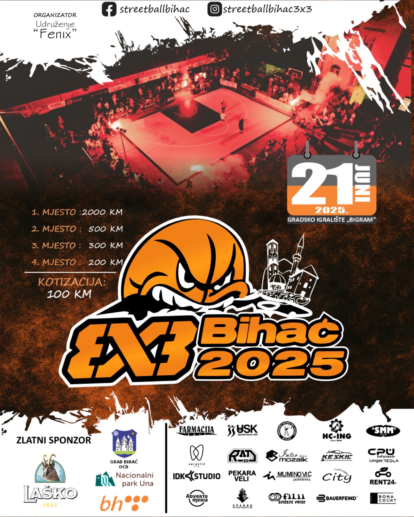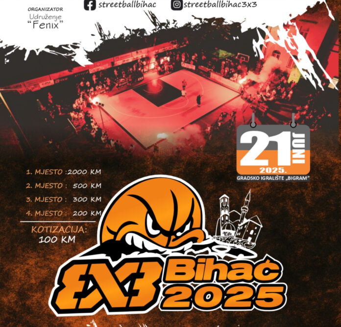Udruženje “Fenix” s ponosom najavljuje 13. izdanje jednog od najpopularnijih sportskih događaja ljeta – Turnir u uličnoj košarci “3×3 Bihać 2025”, koji će se održati u subotu, 21. juna 2025. godine, na legendarnom gradskom igralištu “BIGRAM” u Bihaću.