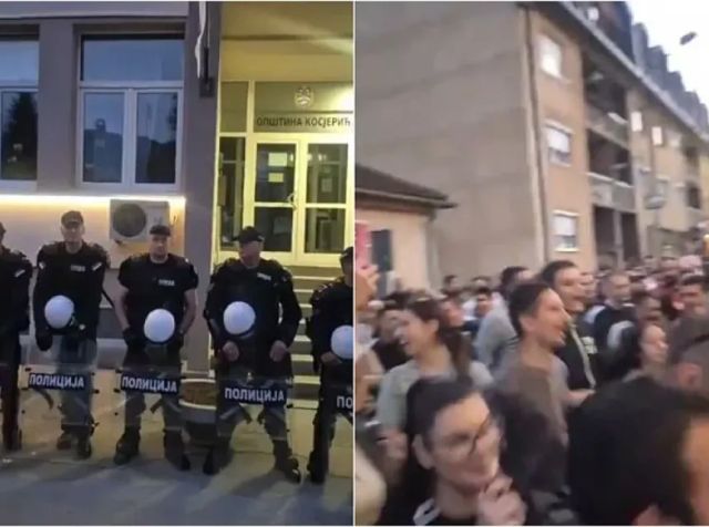 Oni su se okupili ispred zgrade opštine koju čuva veliki broj policijskih službenika.