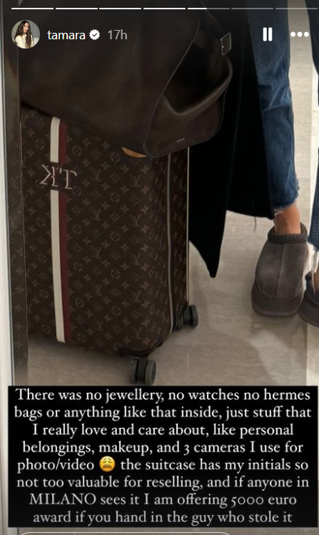 “Unutra nije bilo nakita, satova, Hermes torbica ili ičega takvog, samo stvari koje volim i do kojih mi je stalo. Samo neke osobne stvari, šminka i tri kamere s kojima snimam videe i fotografije. Kofer ima moje inicijale stoga nije previše vrijedan za preprodaju. Ako ga iko vidi u Milanu nudim 5.000 eura nagrade ako predate lika koji ga je ukrao”, napisala je na jednom od Instagram storyja.