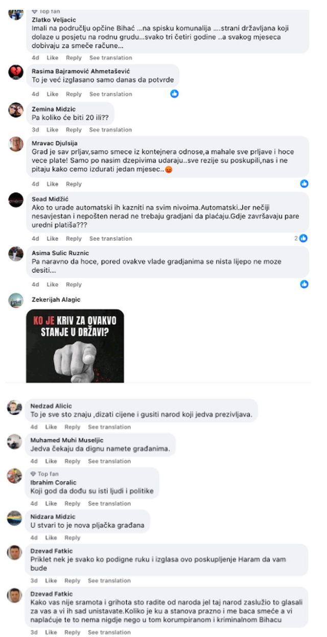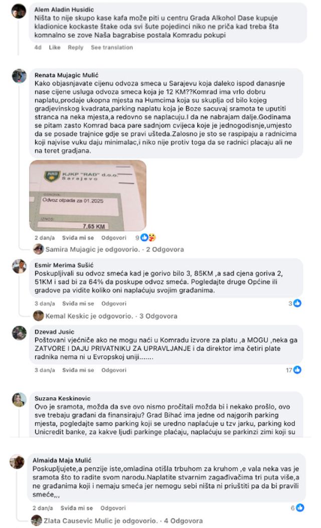Kako neslužbeno saznajemo, nakon velikog pritiska javnosti zbog prijedloga JKP Komrad o povećanju cijena sakupljanja i odvoza otpada za 64%, predstavnici stranaka većine u Gradskom vijeću Bihaća zajedno s gradonačelnikom održali su međustranački sastanak. Na sastanku su razmatrali dostavljeni prijedlog i postigli dogovor o korekcijama, a materijali su vraćeni na doradu.