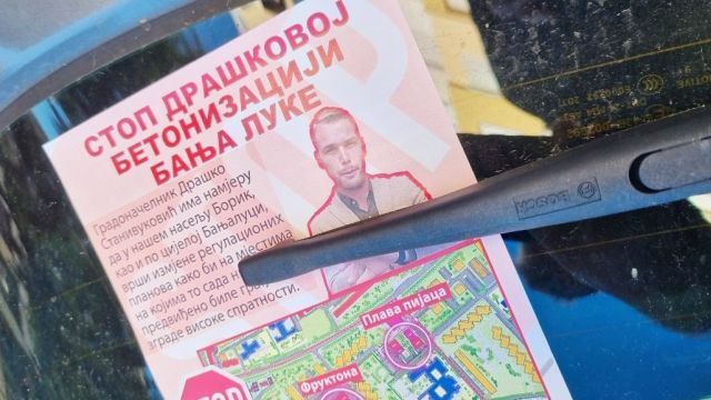 “Gradonačelnik Banjaluke Draško Stanivuković ima namjeru d au našem naselji Borisk, kao i po cijeloj Banjaluci, vrši izmjene regulacionih planova kako bi na mjestima na kojima to sada nije predviđeno bile građene zgrade visoke spratnosti” stoji na letku.