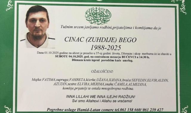 Tužnim srcem javljamo rodbini, prijateljima i komšijama da je CINAC (ZUHDIJE) BEGO dana 01.10.2025.godine na Ahiret je preselio u 37-oj godini život.
