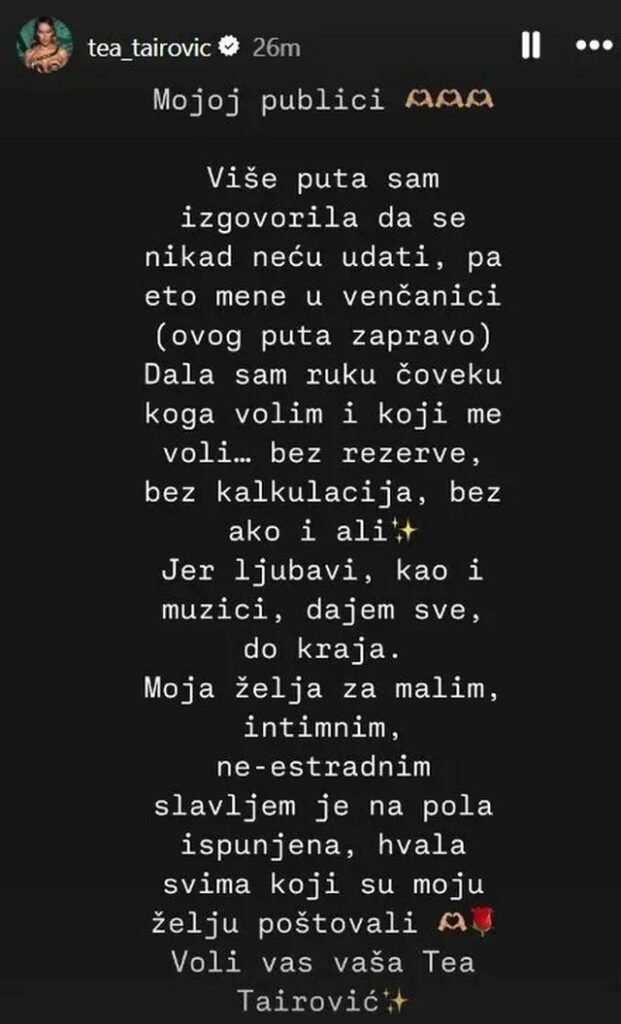 “Jer ljubavi, kao i muzici, dajem sve, do kraja. Moja želja za malim, intimnim, neestradnim slavljem je na pola ispunjena, hvala svima koji su moju želju poštovali. Voli vas vaša Tea Tairović”.