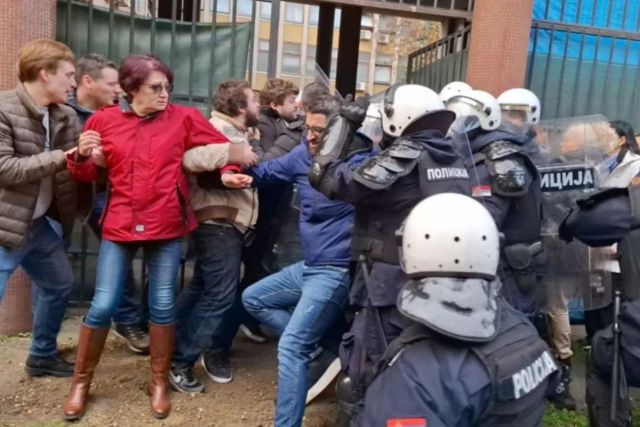 Na licu mjesta nalazi se preko 100 pripadnika žandarmerije i 50 policajaca u opremi za razbijanje demonstracija. Uprkos jakoj prisutnosti policijskih snaga, opozicija je stavila katanac na kolski ulaz, što je izazvalo guranje i napetu situaciju.