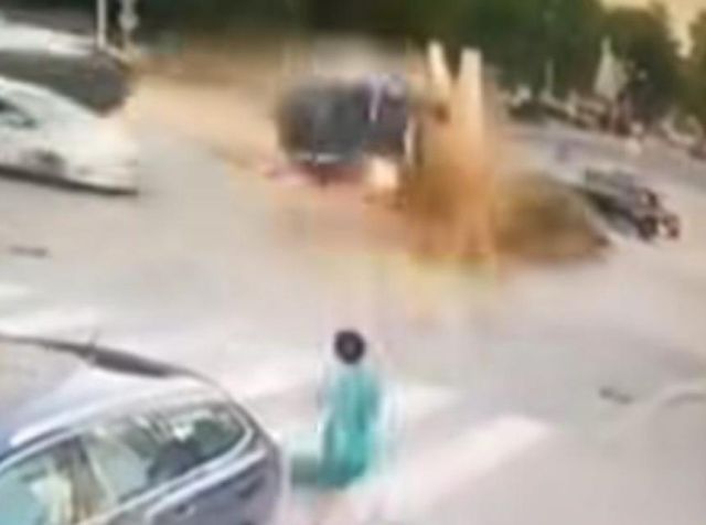 Sudar je bio toliko jak da su kombi i automobil završili prevrnuti, a jedno od vozila se okrenulo na krov i klizilo blizu pješakinje.