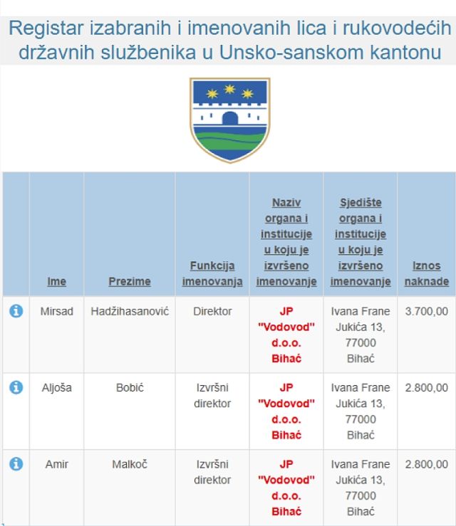 Kada je riječ o upravljanju, JP Vodovod Bihać ima čak tri direktora, a prema podacima iz registra “Ureda protiv korupcije USK”, plaće su prijavljene početkom 2024. godine i one su iznosile bez ikakvih dodataka i toplog obroka: