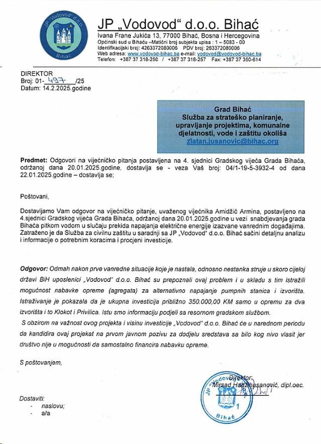 U Bihaću, građani se suočavaju s naglim porastom cijena potrošene vode, dok se istovremeno žale na zastarjelu infrastrukturu i nedostatak ulaganja u ključne projekte. Iako su računi za vodu značajno porasli, a prihodi JP Vodovod su u porastu, problem s vodosnabdijevanjem ostaje. Naime, kako je objavio vijećnik Armin Amidžić, grad već nekoliko sati ostaje bez pitke vode nakon prekida električne energije. Problem je, prema riječima direktora JP Vodovod, rezultat izostanka agregata na ključnim izvorima, a rješenje ovog problema zahtijeva investiciju od 350.000 KM.