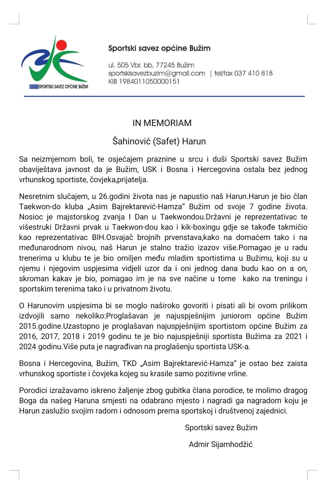 Bužim i cijela Unsko-sanska regija u dubokoj su tuzi zbog iznenadne i tragične smrti Haruna Šahinovića (Safet), vrhunskog sportiste, reprezentativca Bosne i Hercegovine i uzora mladih generacija. Harun je preminuo u 26. godini života, ostavivši iza sebe neizbrisiv trag kako na sportskim borilištima, tako i u srcima svih koji su ga poznavali.