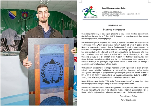 U 26. godini života preminuo je Harun Šahinović, višestruki prvak i reprezentativac BiH u taekwondou i kik-boksu. Bužim i cijela sportska zajednica ostali su bez mladog čovjeka čije su vrline nadilazile sportske terene.