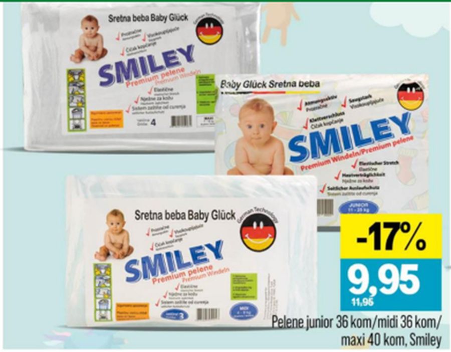 Ovim putem obavještavamo naše cijenjene kupce da je Smiley premium pelena unaprijeđena na kvalitet premium PLUS pelene,što znači da je to pelena proizvedena na najvećem kvalitativnom nivou prateći posljednje standarde i norme EU i kao takva se prodaje u Bingo marketima širom BiH.