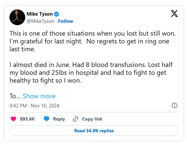“Umalo sam umro u junu. Imao sam osam transfuzija krvi. Izgubio sam pola krvi i 25 kilograma u bolnici i morao sam da se borim da ozdravim i ponovo se borim”, napisao je Tyson na Twitteru, otkrivši da se zbog toga osjeća kao pobjednik. Iako u ringu nije bilo pravog spektakla, borba je masovno gledana. Najmanje 60 miliona ljudi je posmatrala borbu, objavio je Netflix,a ostaje da se vidi da li je to zaista bio posljednji put da je Tyson ušao u ring.
