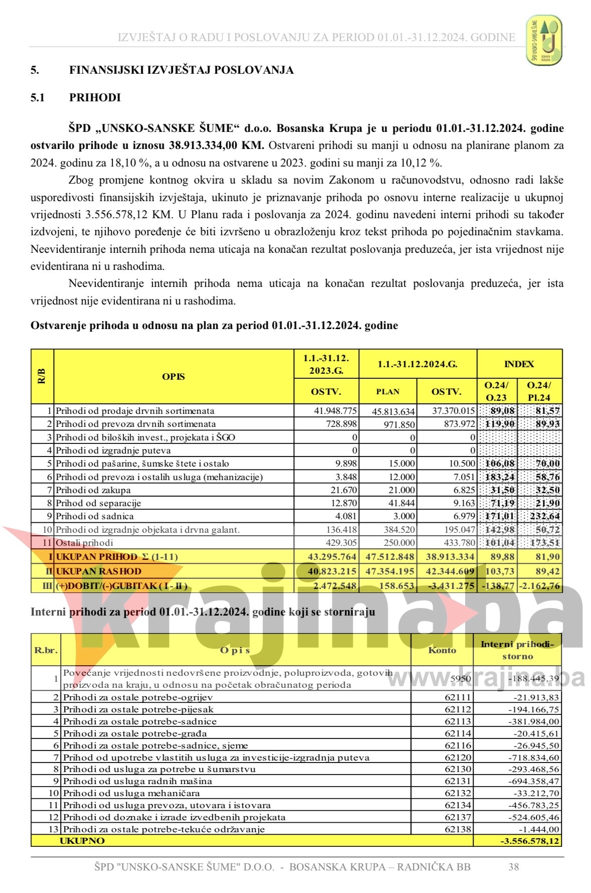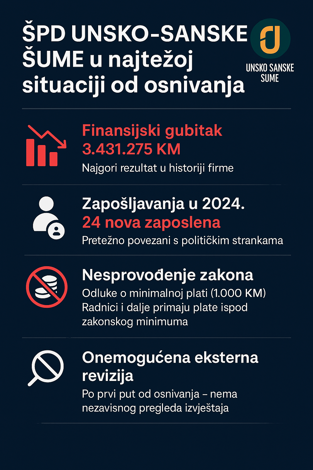 Nekada jedno od najrespektabilnijih javnih preduzeća u Unsko-sanskom kantonu, “Unsko-sanske šume” d.o.o. Bosanska Krupa, danas se nalazi u najtežoj situaciji od svog osnivanja. Preduzeće je godinu 2024. završilo s poslovnim gubitkom od čak 3.431.275 KM, čime je zabilježen daleko najlošiji finansijski rezultat u njegovoj historiji.