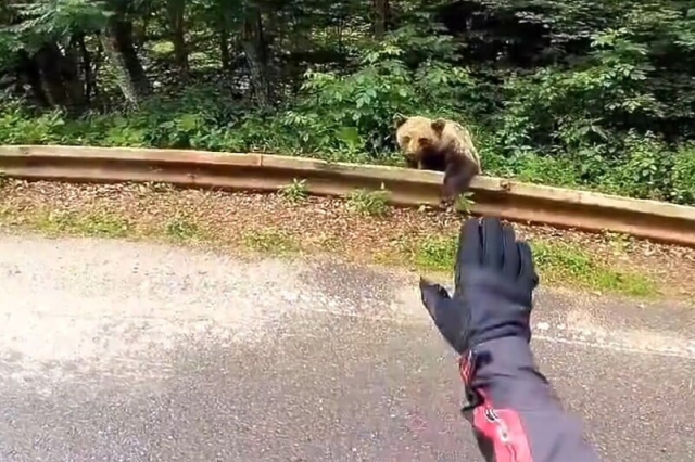 Na snimku objavljenom na društvenoj mreži X, vidi se kako medvjed mirno stoji, potpuno nezainteresovan za prolaznike. Dok bi se zasigurno većina nas preznojila od straha pred divljom zvijeri, motociklista se s njim pozdravio kao s dobrim drugom. Medo je nastavio da uživa i posmatra magistralu, kao da je to njegova svakodnevna rutina.