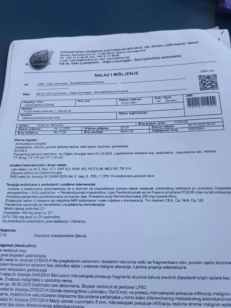 Naša sugrađanka Edina zadnjih mjeseci vodi bitku sa karcinomom želuca (zloćudna novotvorevina želuca C16). Za nastavak adekvatnog liječenja, po preporuci onkologa, potrebno je nabaviti terapiju Pembrolizumab 200mg/Keytruda 25 mg. Taj lijek se ne nalazi na listi indikacija Fonda solidarnosti Zavoda zdravstvenog osiguranja i reosiguranja FBIH (FZZOIR) i stoga