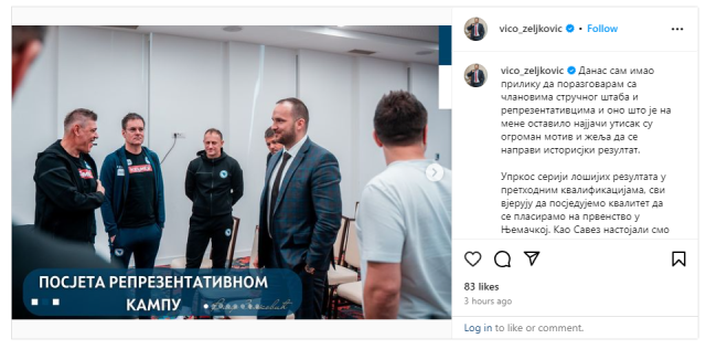 Kako je naveo u objavi na društvenim mrežama, Zeljković je imao priliku da razgovara sa “Zmajevima”, dodavši kako je na njega ogroman utisak ostavila želja da se ostvari historijski rezultat.