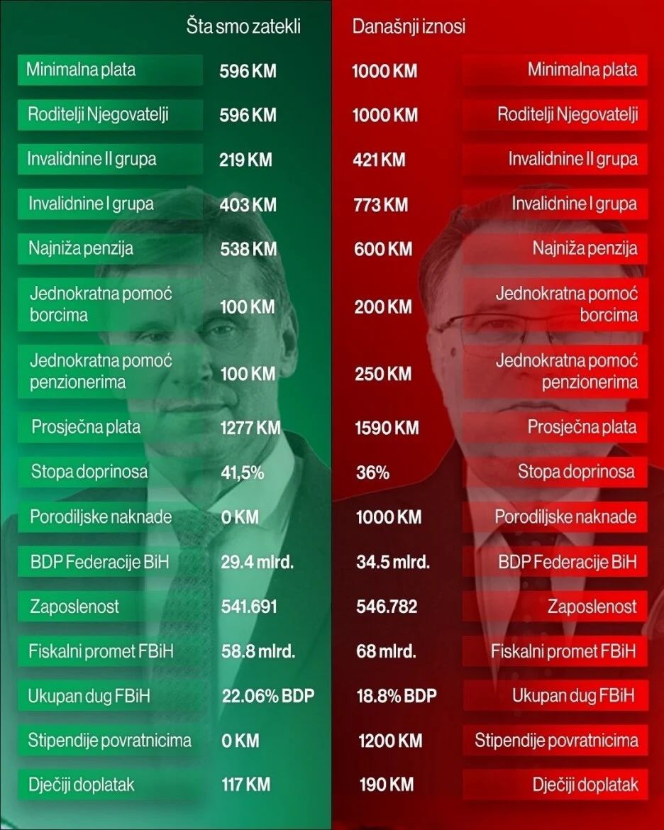 Tako su naveli da su, pri preuzimanju federalne vlasti (op.a. od tadašnjeg premijera Fadila Novalića), zatekli iznos minimalne plate od 596 KM dok ona sada iznosi 1.000 KM te kako je najniža penzija iznosila 538 KM, a sada je 600 KM.