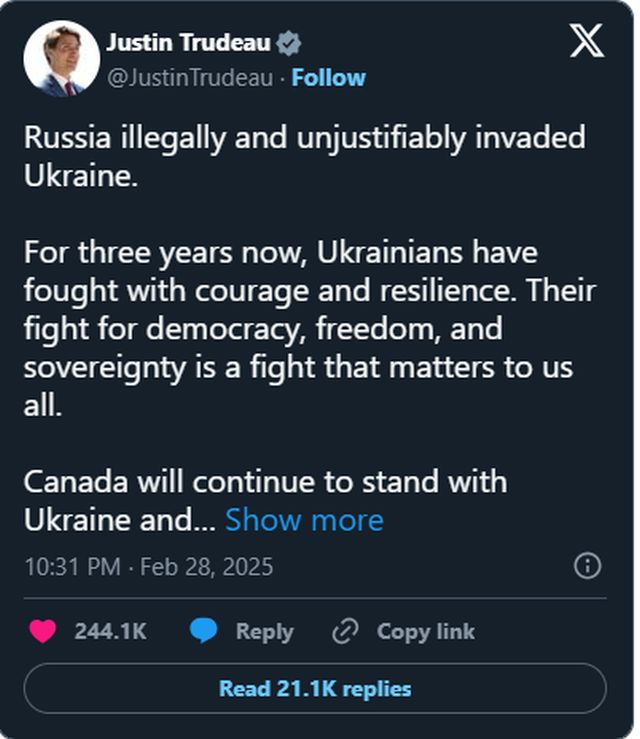 “Rusija je ilegalno i bez razloga napravila invaziju na Ukrajinu. Već tri godine, Ukrajinci se hrabro bore. Njihova borba za demokratiju, suverenitet i slobodu je izrazito važna svima nama. Kanada će ostati uz Ukrajinu i Ukrajince do dostizanja pravednog mira”, napisao je Trudeau.