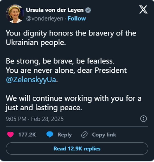 “Vaše dostojanstvo je odalo počast hrabrosti vaših građana. Budite bez straha, snažni i hrabri. Nikada niste sami, predsjedniče Zelenski. Nastavit ćemo da radimo s vama na dostizanju pravednog i dugoročnog mira”, napisala je Von der Leyen.