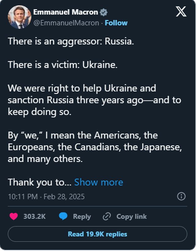 “Postoji agresor: Rusija. Postoji žrtva: Ukrajina. Bili smo potpuno u pravu kada smo pomogli Ukrajini i sankcionisali Rusiju prije tri godine – i s tim ćemo nastaviti. Kada kažem ‘mi’, mislim na Amerikance, Evropljanje, Kanađane, Japance i mnoge druge. Hvala svima koji su do sada pomogli i to i dalje rade, i puno poštovanje onima koji se bore od početka. Oni se bore za svoje dostojanstvo, nezavisnost, za svoju djecu i za sigurnost Evrope”, napisao je francuski predsjednik.