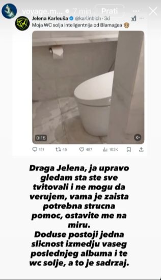 “Draga Jelena, upravo gledam šta ste sve tvitovali i ne mogu da vjerujem, zaista vam je potrebna stručna pomoć. Ostavite me na miru. Ipak, postoji jedna sličnost između vašeg posljednjeg albuma i te WC šolje – to je sadržaj.”