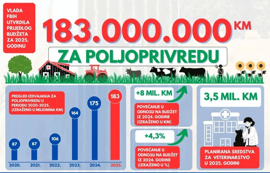 Iz Ministarstva podsjećaju da su izdvajanja za poljoprivredu posljednjih pet godina značajno povećana. Tako je Vlada Federacije BiH za poljoprivredu u 2020 i 2021. godine budžetom planirala po 87 miliona KM, 2022. godine 106 miliona KM, 2023. godine 164 miliona KM, 2024. godine 175 miliona KM dok je ove godine taj iznos, u prijedlogu budžeta, 183 miliona KM.