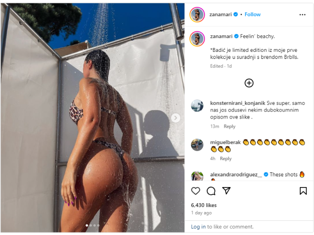Fotografisala se ispod tuša, a stražnjica je bila u prvom planu. U opisu je navela da je nosila kupaći kostim iz njene prve kolekcije. Kao i uvijek, u komentarima su se nizale samo pohvale.