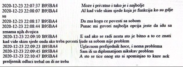 – Može i privatno, tako je najbolje. Ali kad vide s kim sjede, koja je funkcija, ko su, gdje su. Da zna koga će povesti sa sobom. Punac mi govori, najbolja opcija je da idu sa ženama njih dvojica. E, sad, da se radi nešto što je bitno, a to će znati kada vide s kim sjede, onda ako treba povesti ljude sa sobom to nije problem. Uglavnom, predsjednik hoće, i nema problema. Sam ili sa diplomatijom, nikakav problem. A što se tiče ono što si spominjao, nek predsjednik odluči treba li on ili ne treba – pisalo je u porukama pronađenim u Sky telefonu Dženisa Kadrića.