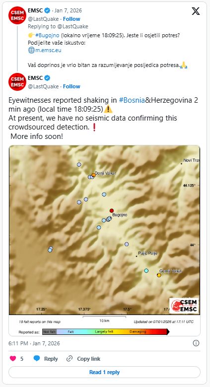 Epicentar je bio kod Bugojna, a osjetio se i u Donjem i Gornjem Vakufu.