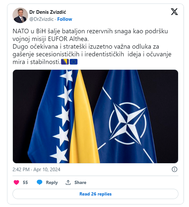 “NATO u BiH šalje bataljon rezervnih snaga kao podršku vojnoj misiji EUFOR Althea. Dugo očekivana i strateški izuzetno važna odluka za gašenje secesionističkih i iredentističkih ideja i očuvanje mira i stabilnost”, poručio je Zvizdić na Twitteru.